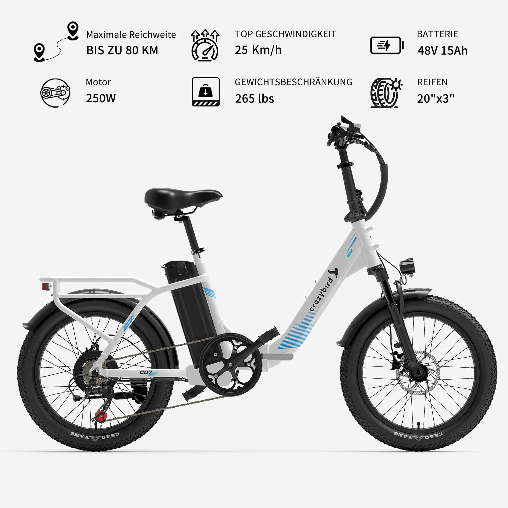 Das Crazybird CU7 Falt-Elektrofahrrad ist ein kompaktes und tragbares Elektrofahrrad für Pendler und Reisende in der Stadt. Es ist so konzipiert, dass es leicht zusammen- und auseinandergeklappt werden kann und sich bequem in kleinen Räumen wie Wohnungen, Büros oder im Kofferraum eines Autos verstauen lässt. Diese Funktion verbessert die Tragbarkeit und erleichtert das Tragen, wenn nötig.