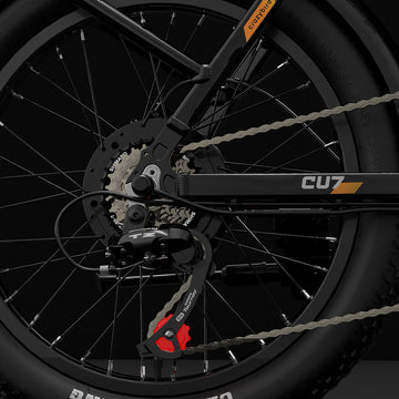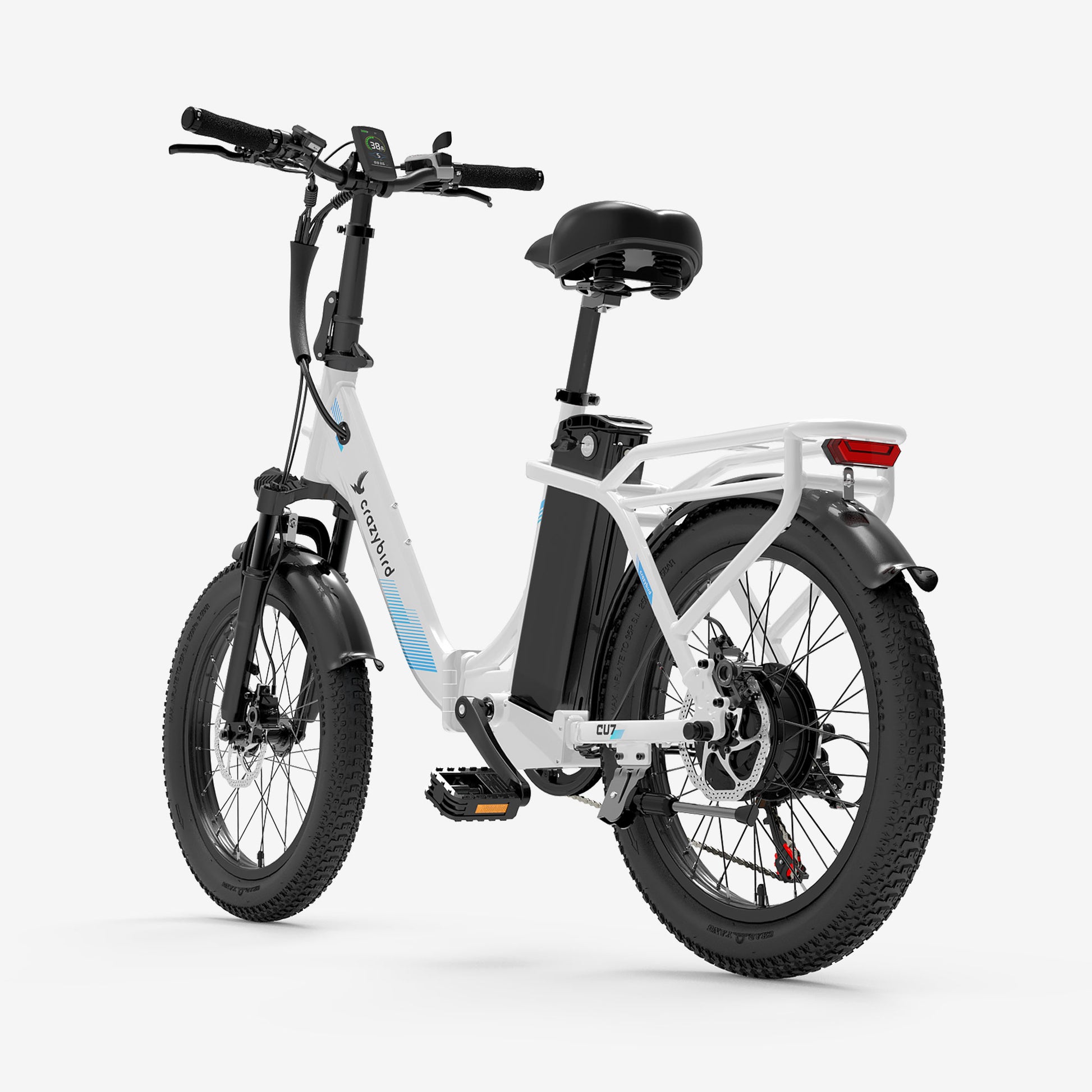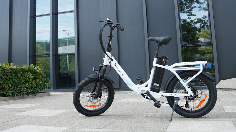 Das CU7 ist mit Funktionen ausgestattet, die für den Stadtverkehr konzipiert sind, darunter integrierte Lichter für bessere Sichtbarkeit und Schutzbleche zum Schutz vor Spritzern sowie 20 x 3 Zoll große Reifen für Fahrten auf unterschiedlichem Gelände. Die breiteren Reifen bieten besseren Grip und Dämpfung für mehr Fahrkomfort.