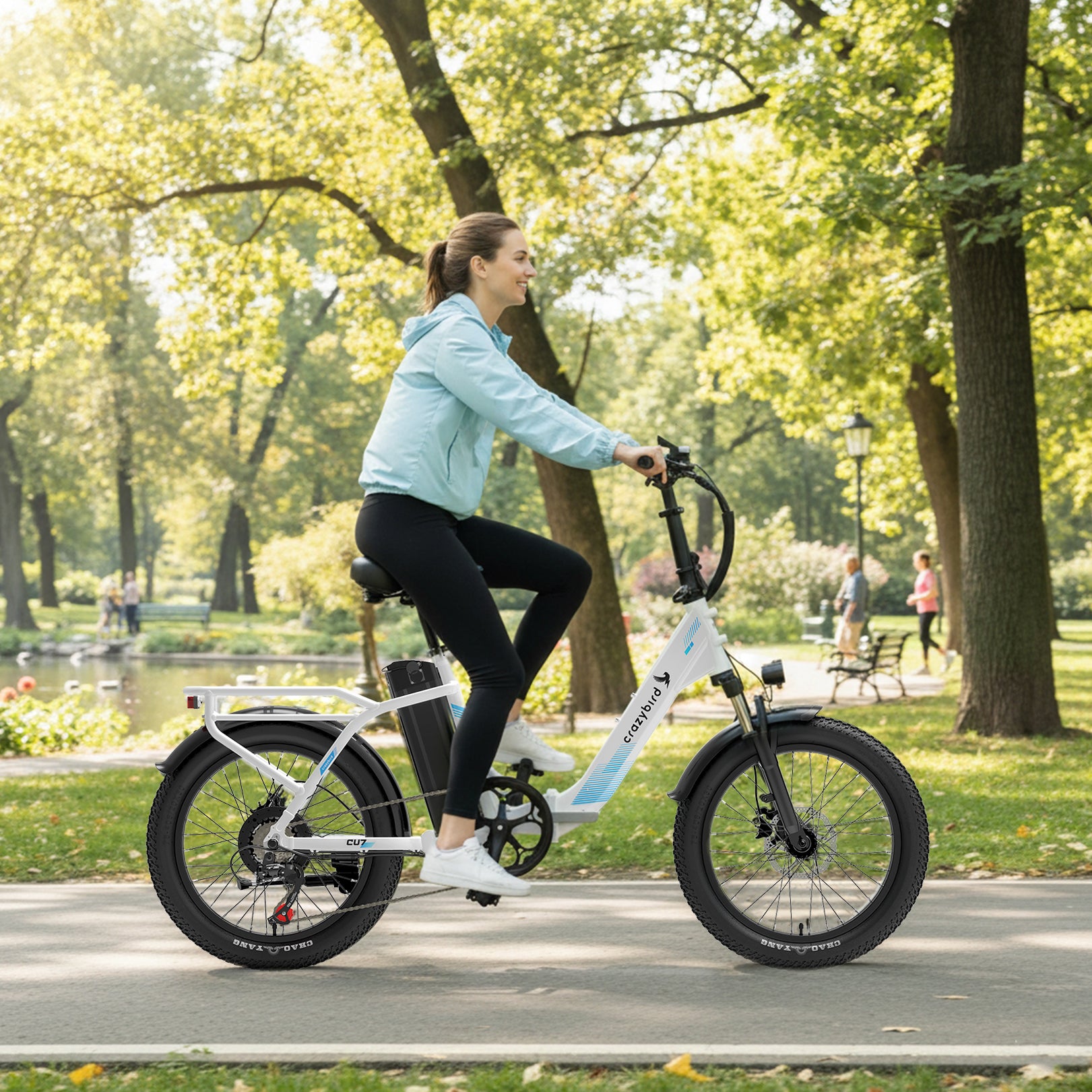 Klein, wendig und praktisch – ein Kompakt-E-Bike ist der ideale Begleiter und bietet herausragende Flexibilität und Vielseitigkeit. Ob Pendeln mit öffentlichen Verkehrsmitteln, Einkaufen in der Stadt oder Reisen im Wohnmobil – dank des kompakten Designs und der kleineren Räder lässt sich das Crazybird CU7 platzsparend verstauen und transportieren.